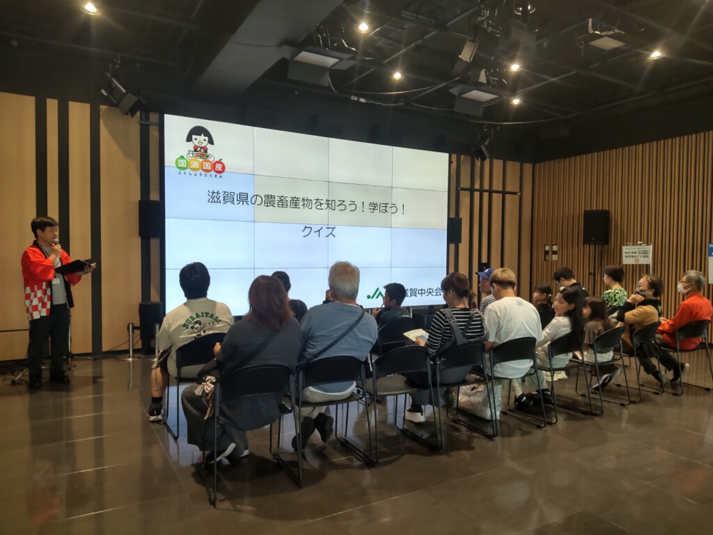 当日、用意されたPRブースにおいて滋賀の農畜産物クイズを出題。会場の参加希望者を募り、正解者には「国消国産」グッズをプレゼントしました。