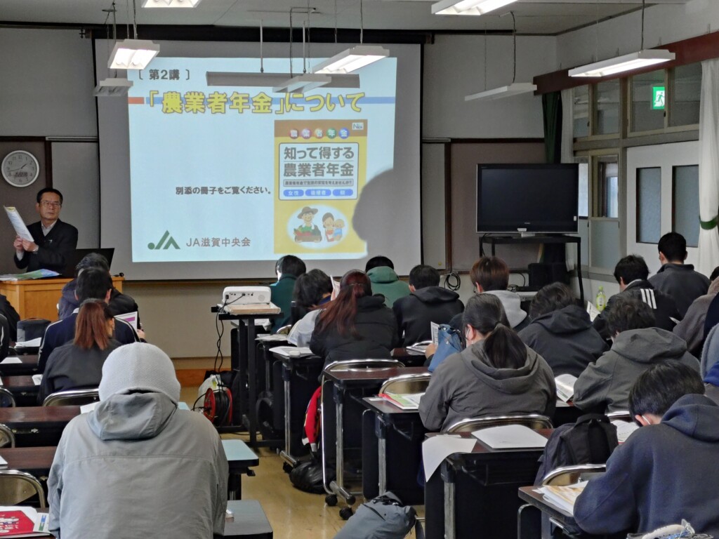 JA滋賀中央会は昨年末、近江八幡市安土町大中にある滋賀県立農業大学校に出向き、同校の養成科の1・2年生34人と就農科の学生5人に対して、「JAの役割と業務内容」と「農業者年金の制度と仕組み」に関する特別講話を行いました。