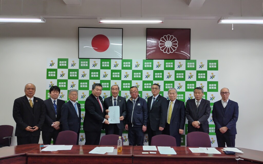 JAグループ滋賀と農政連盟 自由民主党滋賀県議会議員団に要請 JAグループ滋賀と滋賀県農政連盟は、2月18日、自由民主党滋賀県議会議員団に「施設整備の加速化支援に関する要請」を行いました。 本県のJAでは、「新基本計画実装・農業構造転換支援事業」を活用したJA共同利用施設の整備を進めており、令和7年度補正予算での同事業の制度改訂に合わせて、県からの予算措置の充実を求めました。 要請書を手交する自民党県議団とJAグループ滋賀・県農政連盟 自民党県議団へ要請するJAグリーン近江 大林組合長